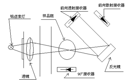 光通過(guò)透鏡聚焦后照射到樣品瓶上,一部分信號(hào)由 90o接收器接受,另外分別由前向透射接收器和前向散射接收器接收。