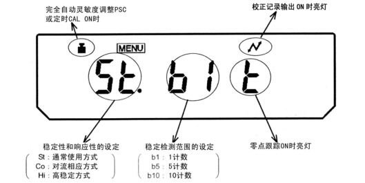 3. 按【O/T】鍵顯示[b-1]。此后,每按一次【CAL】鍵,顯示按[b-1]、[b-5]、[b-10]依次變化。分別表示穩(wěn)定檢測(cè)范圍 1 讀數(shù)、5 讀數(shù)、10 讀數(shù)。顯示現(xiàn)在的設(shè)定時(shí),顯示穩(wěn)定標(biāo)志(?)。