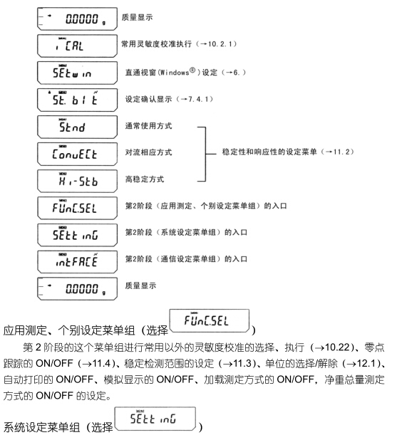第 2 階段的這個(gè)菜單組進(jìn)行天平與外部?jī)x器連接時(shí)的通信形式的設(shè)定(→14.3)。有預(yù)先組合的校準(zhǔn)形式和可選擇每個(gè)項(xiàng)目的用戶形式。