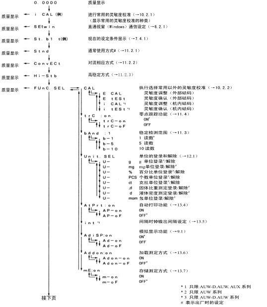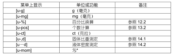 AUW-D/AUW/AUX/AUY 系列可以顯示 g 以外單位的質(zhì)量。預先登錄的單位,在質(zhì)量顯示時只須按【UNIT】鍵,即可切換顯示。出廠時,登錄的是 g、%、PCS、ct。使用 AUW-D/AUW/AUX/AUY 系列具備的其他單位時,按照 12.1 進行預先登錄。不使用的單位也可以解除。但是 g 不能解除。個數(shù)計算、比重測定的功能也按 12.1 單位設定進行登錄和解除。登錄了的單位可在質(zhì)量顯示中使用【UNIT】鍵調(diào)出。關于個數(shù)計算請參閱 13.1,關于固體比重測定,液體比重測定分別參閱 13.2 和 13.3。