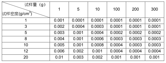 3)查表的例:測定密度為 8g/cm3,試樣量為 5g的試樣時,產(chǎn)生最大為±0.0001 的誤差。估計測定結(jié)果在 7.999~8.001 范圍內(nèi)漂移,有時小數(shù)點以后 4 位數(shù)不讀取,不算異常。