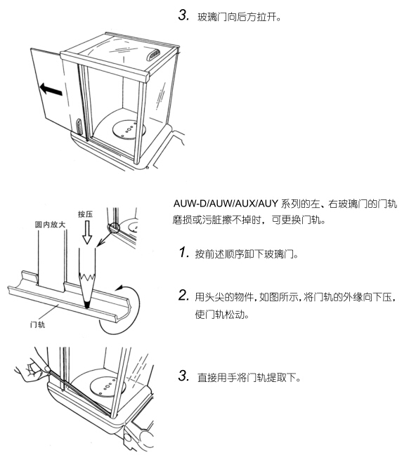操作時請?zhí)貏e小心不要讓門軌劃傷手。玻璃拉門不滑時AUW-D/AUW/AUX/AUY 系列可以卸下玻璃門,清掃門軌。