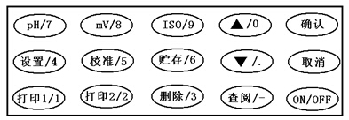 此時,pH、mV和校準鍵均有效。如按下其中某一鍵,則儀器進入相應的工作狀態(tài)。