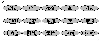 儀器共有15個操作鍵,分別為:ON/OFF、pNa、mV、濃度、校準、打印1、打印2、貯存、刪除、查閱、保持、▲、▼、確認和取消。