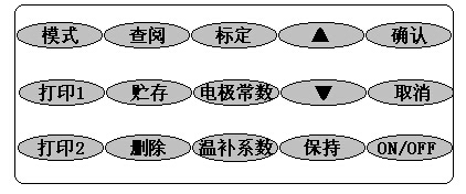 儀器面板上共有15個(gè)操作鍵,分別為:模式、打印1、打印2、查閱、貯存、刪除、標(biāo)定、電極常數(shù)、溫補(bǔ)系數(shù)、▲、▼、保持、確認(rèn)、取消、ON/OFF等。各鍵功能分別定義如下: