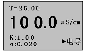 a. 將電導(dǎo)電極接入儀器,將溫度電極拔去,儀器則認(rèn)為溫度為25.0℃,此時(shí)儀器所顯示的電導(dǎo)率值是未經(jīng)溫度補(bǔ)償?shù)慕^對(duì)電導(dǎo)率值;