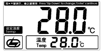 如果用戶需要設置溫度,用溫度計測出被測溶液的溫度,然后按“溫度”鍵,儀器顯示如圖:再按“△”或“▽”鍵調(diào)節(jié)顯示值,使溫度顯示為被測溶液的溫度,按“確認”鍵,即完成當前溫度的設置,返回測量狀態(tài)。