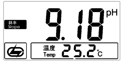 3.再次清洗電極并插入標準緩沖溶液 2 中(pH=9.18pH 的標準緩沖溶液中);用溫度計測出溶液的溫度值(如 25.2℃),并設置溫度值;稍后,儀器會顯示標準緩沖溶液的 pH 值,如圖,按“確認”鍵,儀器自動完成二點標定,否則按“斜率”鍵退出標定,儀器返回測量狀態(tài)。二點標定(斜率)狀態(tài)顯示示意圖(圖 13)