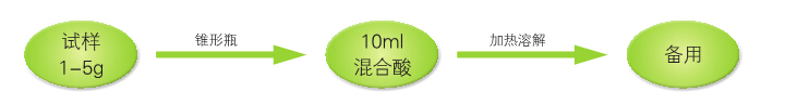 2. 加 10ml 混合酸,加蓋浸泡過夜,加一小漏斗于電爐上加熱消解,若變棕黑色,再加混合酸,直至冒白煙,消化液呈無色透明或略帶黃色,放冷,用滴管將試樣消化液洗入或過濾入 10-25ml 的容量瓶中,用少量的水多次洗滌錐形瓶或高腳燒杯,洗液合并與容量瓶中并定容至刻度,混勻備用,同時作試劑空白。