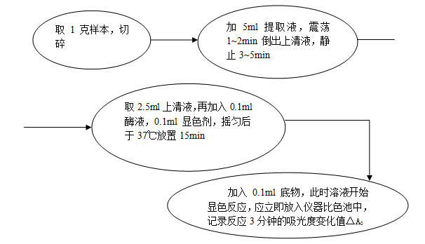 對(duì)照溶液測(cè)定:先于試管中加入2..5mi緩沖液,再加入0.1ml酶液,0.1ml顯色劑,搖勻后于37℃放置15min以上(每批樣品的控制時(shí)間應(yīng)一致)。加入0.1ml底物,此時(shí)溶液開始顯色反應(yīng),應(yīng)立即放入儀器比色池中,記錄反應(yīng)3分鐘的吸光度變化值ΔA0
