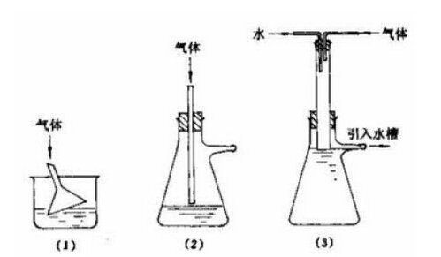 (1)和(2)可作少量氣體的吸收裝置。(1)中的玻璃漏斗應略微傾斜使漏斗口一半在水中,一半在水面上。這樣,既能防止氣體逸出,亦可防止水被倒吸至反應瓶中。若反應過程中有大量氣體生成或氣體逸出很快時,可使用圖(3)的裝置,水自上端流入(可利用冷凝管流出的水)抽濾瓶中,在恒定的平面上溢出。粗的玻管恰好伸入水面,被水封住,以防止氣體逸人大氣中。圖中的粗玻管也可用Y形管代替。
