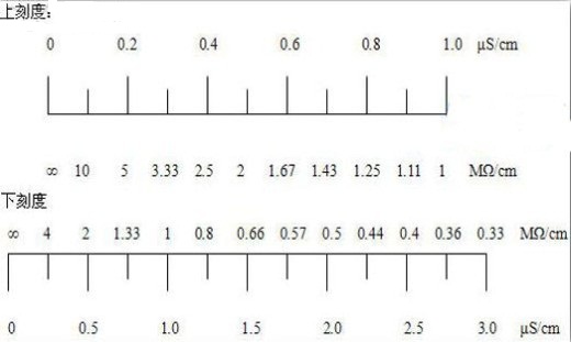 例一,K1置于“×1B”(0~1μS/cm)檔,指針讀數(shù)為0.8,所使用的電極常數(shù)為0.1,則被測(cè)液的電導(dǎo)率就是0.8×0.1μS/cm=0.08μS/cm。