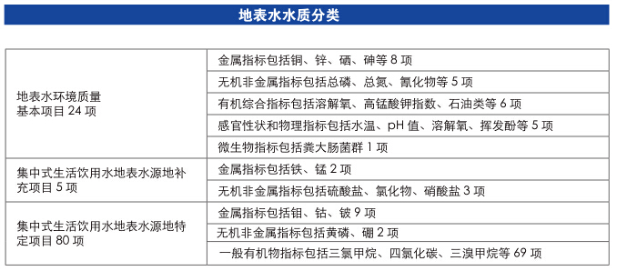 本標(biāo)準(zhǔn)項(xiàng)目共計(jì)109項(xiàng),其中地表水環(huán)境質(zhì)量標(biāo)準(zhǔn)基本項(xiàng)目24項(xiàng),集中式生活飲用水地表水源地補(bǔ)充項(xiàng)目5項(xiàng),集中式生活飲用水地表水源地特定項(xiàng)目 80 項(xiàng)。集中式生活飲用水地表水源地補(bǔ)充項(xiàng)目和選擇確定的特定項(xiàng)目作為基本項(xiàng)目的補(bǔ)充項(xiàng)目。