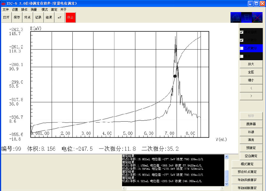 準確稱取雙甘膦0.18g(精確至0.0002g)于50ml滴定杯中,放入攪拌珠,加入三乙醇胺5ml,緩沖溶液20ml。儀器自動判別滴定終點,顯示測試結(jié)果。