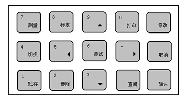 儀器面板上共有15個(gè)操作鍵,分別為:貯存/1、刪除/2、6/3、切換/4、3/5、測(cè)試/6、測(cè)量/7、標(biāo)定/8、5/9、打印/0、4/.、查閱、確認(rèn)、取消、修改。除了“查閱”、“確認(rèn)”、“取消”、“修改”四個(gè)鍵是單功能以外,其他的鍵都是復(fù)用的,它們有兩種功能,即既有功能鍵又有數(shù)字鍵的作用,平時(shí)它們作為功能鍵,按這些鍵可以完成相應(yīng)的功能;而第二功能即為數(shù)字鍵,當(dāng)且僅當(dāng)需要輸入數(shù)據(jù)時(shí),這些鍵作為數(shù)字鍵。如“測(cè)量/7”鍵,平時(shí)按此鍵,可以在儀器的起始狀態(tài)下進(jìn)入測(cè)量狀態(tài);在輸入數(shù)字時(shí),按此鍵,將輸入數(shù)字“7”。