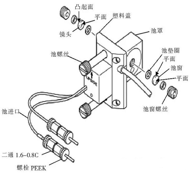 解決方法:在停泵或者使用空氣池的情況下觀察氘燈能量是否穩(wěn)定。若樣品池與參比池能量不穩(wěn)定,則必須更換氘燈;觀察流通池內(nèi)是否有氣泡,可以使用異丙醇或甲醇(使用注射器注射,從流通池進(jìn)口緩緩?fù)迫?/span>)清洗流通池內(nèi)部,排除氣泡。流通池的出口處連接的是一根0.3mmI.D.×2m的背壓管(增加背壓,防止氣泡產(chǎn)生),檢查背壓管是否完好或者增加背壓設(shè)備;拆除流通池然后清洗池透鏡(流通池構(gòu)造如圖1所示),如果無(wú)法去除污漬,請(qǐng)安裝新的池透鏡(安裝池透鏡片時(shí)需注意,鏡片下面一定要先放置池墊圈,否則會(huì)導(dǎo)致鏡片被壓碎);觀察室內(nèi)環(huán)境是否符合液相色譜的實(shí)驗(yàn)室環(huán)境要求,改變儀器的位置,或防止所在環(huán)境有過(guò)多的變化; 雙波長(zhǎng)模式中的噪音振幅是單波長(zhǎng)模式中的10倍以上。小量的波長(zhǎng)更改會(huì)使流動(dòng)相吸光度發(fā)生非常大的更改。吸光度變化越大,噪音也就越大。更改波長(zhǎng),使其每單位波長(zhǎng)的變化對(duì)吸光度產(chǎn)生的變化最小。通過(guò)這三步檢查,故障即可排除。