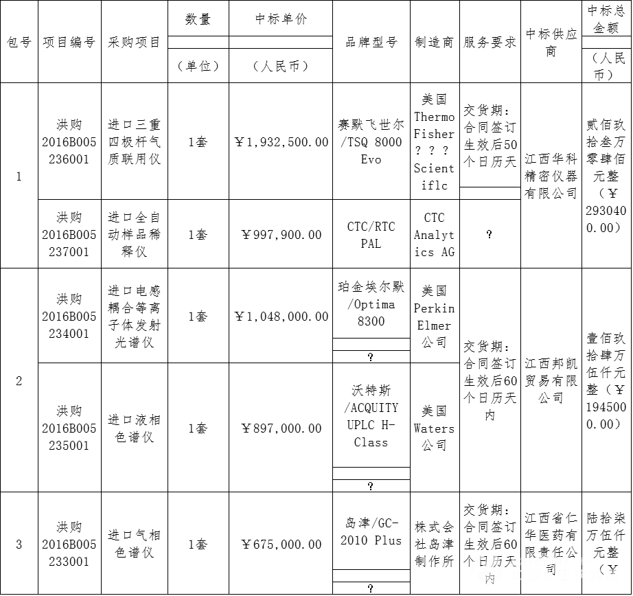 2016年7月18日,南昌市疾病預(yù)防控制中心進(jìn)口設(shè)備采購項(xiàng)目中標(biāo)結(jié)果公布,賽默飛世爾、沃特世、島津等全球知名企業(yè)入圍,分別是賽默飛世爾公司的進(jìn)口三重四極桿氣質(zhì)聯(lián)用儀、CTCAnalyticsAG(瑞士思特斯分析儀器公司)的進(jìn)口全自動樣品稀釋儀、美國PE的進(jìn)口電感耦合等離子體發(fā)射光譜儀、Waters公司的進(jìn)口液相色譜儀以及島津公司的進(jìn)口氣相色譜儀。