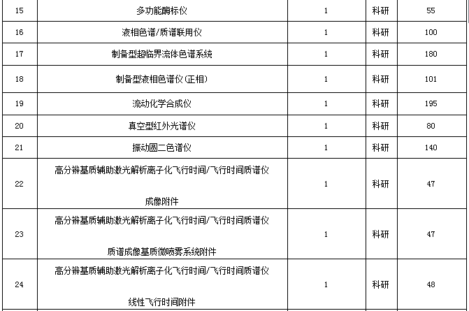 此次采購項目包含24臺/套儀器設(shè)備,其中質(zhì)譜相關(guān)儀器6臺/套,液相色譜相關(guān)儀器3臺/套,顯微鏡相關(guān)儀器2臺/套,此次招標(biāo)可謂是近期儀器采購項目中的又一大單。