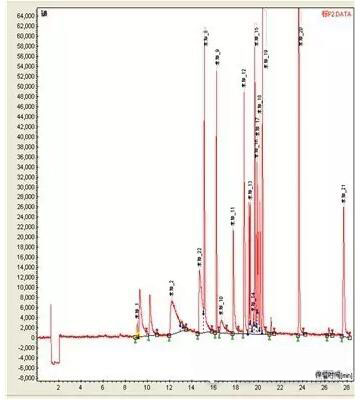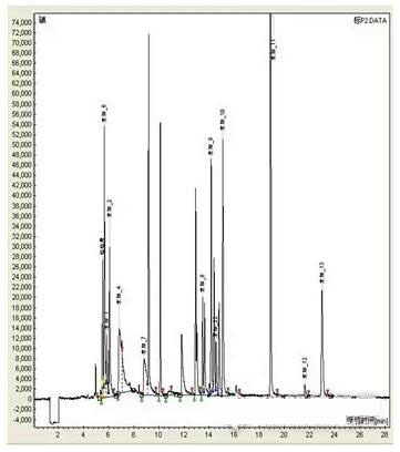 我們對上面的程序升溫條件進(jìn)行了優(yōu)化,柱溫由100℃降到80℃,程序升溫:80℃保持1min,8℃/min升到250℃,保持6.0min,共28.25min.