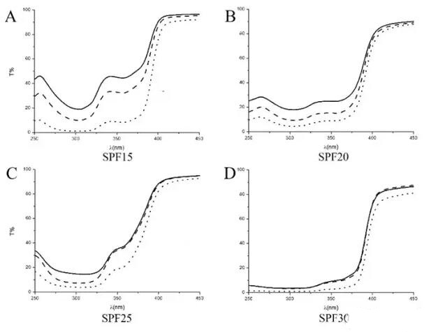 說(shuō)明SPF值越大的化妝品對(duì)紫外光譜的遮蔽效應(yīng)越明顯,這與化妝品的真實(shí)效應(yīng)相符,同時(shí)也驗(yàn)證了使用本法進(jìn)行防曬化妝品的檢驗(yàn)和評(píng)價(jià)是可行和可靠的。