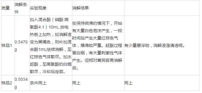 1.濕法消解,加入混合酸10mL進行消解,消解過程比較耗時,產(chǎn)生大量紅棕色氣體,爆沸較嚴重,難于控制;消解液有少量懸浮物,消解效果還不錯。