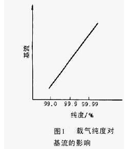 載氣純度直接影響ECD的基流或基頻。圖1為載氣純度對基流的影響。為保證ECD池的潔凈,降低雜質(zhì)俘獲池中的自由電子,一般要求載氣純度在99.99%以上,還要外加凈化器,以除去殘留的氧和水。氧具有強(qiáng)烈的吸電子性,使基流下降。