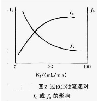 (2)保持ECD達(dá)飽和基流I0(恒頻率)或穩(wěn)定基頻ƒ0(恒電流)。因I0隨通過檢測器氣體流速增加而增大,ƒ0 即隨流速增加而減小,且兩者均至一定值后達(dá)穩(wěn)定,見圖2。