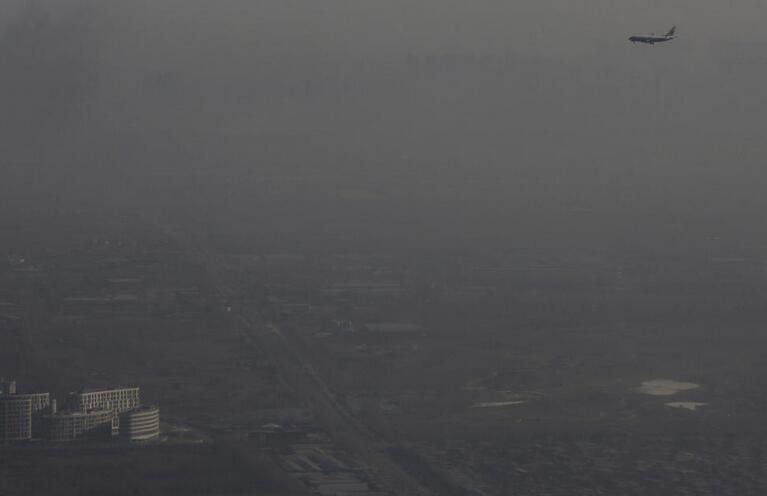 1月2日,從飛機(jī)上俯瞰北京近郊霧霾,地面模糊不清,灰蒙蒙一片。自去年12月29日以來,受不利天氣形勢(shì)影響,中國(guó)出現(xiàn)大范圍持續(xù)重度空氣污染,人們出行都戴著防霧霾口罩。