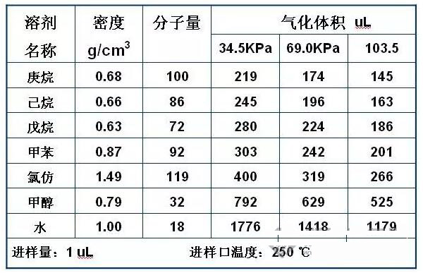 溶液樣品經(jīng)常分析低含量組分,因此需要較大的進樣量。大進樣量下溶劑大量汽化,產(chǎn)生較高的沖擊壓力,并可能造成襯管超載。為了控制這個問題,現(xiàn)代色譜提供了高壓進樣功能。即在在較高的柱前壓下進樣,進樣完成后迅速降低柱前壓到合適壓力,提供合理的載氣流速。高壓下,汽化體積明顯減小,可以避免大容量進樣下襯管超載。同時汽化體積的減小降低了柱前壓的變化幅度,減小了沖擊。不同溶劑的汽化體積如下表: