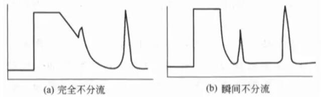 對柱容量壓力過大,產(chǎn)生拖尾的問題,特別是不分流進樣下。高柱前壓本身有利于減小這一問題,但現(xiàn)代色譜對這一問題的解決,主要是采用瞬間不分流。即必須采用不分流測定低含量組分的時候,在樣品充分轉(zhuǎn)移后開啟一個大的分流流量,讓襯管中殘留的溶劑被迅速從分流出口吹出,減小了進樣時間,降低拖尾的情況。這一樣品轉(zhuǎn)移時間,從30s到2分鐘左右,根據(jù)具體情況,用實際工作驗證后確定。也就是說,時間合不合理,進樣看看效果就是了。這是一張選自《化驗員讀本》的圖片,可以清楚的看到效果。