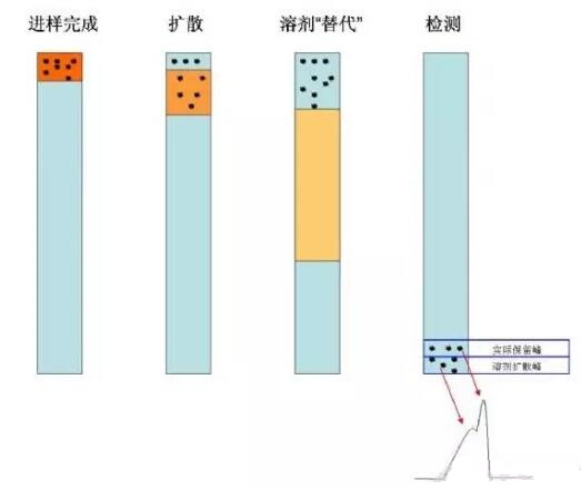 造成這些現(xiàn)象的原因只有一個(gè):溶解分析物F的溶劑,增加進(jìn)樣體積只是放大了溶劑影響。在我們的實(shí)驗(yàn)中,溶劑采用80%的甲醇溶解,而流動(dòng)相是15%的乙腈,在反相色譜中,80%的甲醇洗脫能力強(qiáng)于15%的乙腈,就是說溶解F的溶劑極性小于流動(dòng)相的極性。當(dāng)樣品進(jìn)入色譜后,一部分分析物質(zhì)會(huì)和固定相結(jié)合,一部分還沒有和固定相結(jié)合就被洗脫能力強(qiáng)的溶劑帶著沿流動(dòng)方向移動(dòng)(色譜柱縱軸),這樣分析物就發(fā)生了擴(kuò)散(圖5擴(kuò)散),當(dāng)進(jìn)樣體積加大,進(jìn)入色譜系統(tǒng)的溶劑會(huì)改變色譜柱的流動(dòng)相組成,甚至?xí)斕娴袅鲃?dòng)相(圖5溶劑替代),在溶劑的洗脫下,出峰時(shí)間就會(huì)提早,溶劑里的分析物F和在色譜過程開始的與固定相結(jié)合的分析物F會(huì)先后流出,這樣就形成了分叉峰(圖5檢測)。
