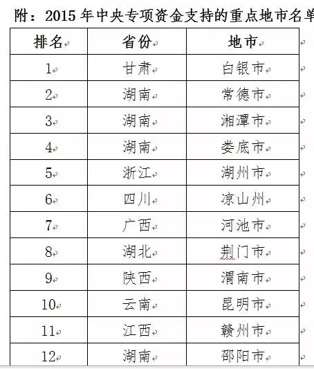 通過初步審查和現場競爭評審,考察了申報區(qū)域污染治理的緊迫性、方案的合理性、基礎工作條件、保障措施等,財政部、環(huán)境保護部確定對綜合排名前30位的地市(下轄38個重點區(qū)域)予以支持。中央資金將連續(xù)三年對重點區(qū)域進行支持,其中2015年下達資金279315萬元,用于加快推進重金屬污染綜合防治。同時,根據2014年度《規(guī)劃》實施考核結果,對存在突出問題的地市,資金安排按一定比例予以扣減。