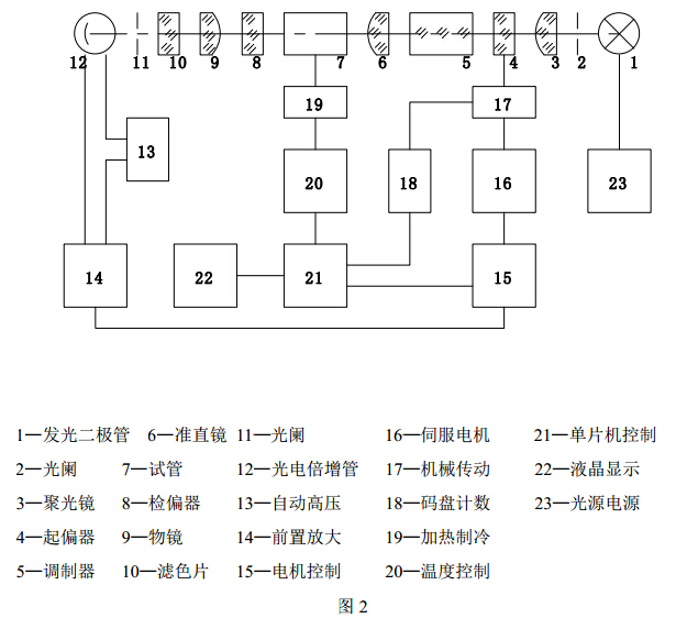 圖2是儀器的結(jié)構(gòu)框圖。發(fā)光二極管發(fā)出的光依次通過(guò)光闌、聚光鏡、起偏器、法拉第調(diào)制器、準(zhǔn)直鏡。形成一束振動(dòng)面隨法拉第線圈中交變電壓而變化的準(zhǔn)直的平面偏振光,經(jīng)過(guò)裝有待測(cè)溶液的試管后射入檢偏器,再經(jīng)過(guò)接收物鏡、濾色片、光闌、波長(zhǎng)為 589.3nm 的單色光進(jìn)入光電倍增管,光電倍增管將光強(qiáng)信號(hào)轉(zhuǎn)變成電訊號(hào),并經(jīng)前置放大器放大。自動(dòng)高壓是按照入射到光電倍增管的光強(qiáng)自動(dòng)改變光電倍增管的高壓,以適應(yīng)測(cè)量透過(guò)率較低的深色樣品的需要。若檢偏器相對(duì)于射入的偏振光平面偏離正交位置,則通過(guò)頻率為 f 的交變光強(qiáng)信號(hào),經(jīng)光電倍增管轉(zhuǎn)換成頻率 f 的電信號(hào),此電信號(hào)經(jīng)過(guò)前置放大后輸入電機(jī)控制部分,再