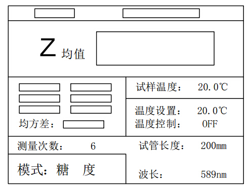 d) 測(cè)糖度時(shí),模式選 4,測(cè)量?jī)?nèi)容顯示國(guó)際糖度,數(shù)據(jù)欄顯示 Z 及 Z 均值,需要輸入測(cè)量的次數(shù)。儀器在轉(zhuǎn)換成糖度顯示時(shí)均當(dāng)作 200mm 長(zhǎng)度試管處理,如果使用其它長(zhǎng)度試管可自行簡(jiǎn)單計(jì)算。