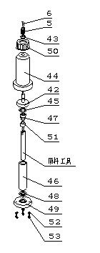 b) 滴定管在滴定前,特別是在做不同濃度的滴定,或是在不同溶液的滴定前,必須對滴定管進(jìn)行清洗。滴定管(4)的裝配示意圖見左圖,在裝配時(shí),在儀器備件中拿出頂桿工具,裝在滴定管裝置下端活塞桿(51)上,如左圖。然后按左圖所示,先拆下螺釘M3×8(3只)(53)、彈簧墊圈(3只)(52)、再拿出下密封環(huán)(49)、下密封圈(48)、滴定管(46)和活塞(47),拆下滴定管(46),用蒸餾水反復(fù)清洗滴定管,清洗完畢,用濾紙吸干滴定管(46)口的水珠。然后按圖示安裝滴定管,先將活塞(47)用頂桿工具從滴定管(46)上口裝入,然后將滴定管(46)和活塞(47)裝入保護(hù)罩(44)內(nèi),滴定管(46)上口應(yīng)與上密封圈(45)緊貼,且不能碰碎滴定管(46),再將下密封圈(48)、下密封環(huán)(49)安裝好,最后用螺釘M3×8(3只)(53)、彈簧墊圈(3只)(52)將滴定管拼緊,注意,在用螺釘M3×8(3只)(53)拼緊時(shí),應(yīng)均勻拼緊,否則滴定管可能漏液,影響滴定精度。然后利用頂桿工具將活塞(47)拉到最低點(diǎn)(如圖示位子)。
