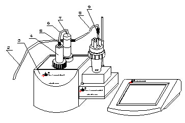 a) 將容量滴定單元(3)與和控制單元放在試驗(yàn)臺上,按圖示將攪拌器(15)放在永停測量單元(16)上, 插入電極梗(10);裝入溶液杯支架(12)和溶液杯(13),在溶液杯(13)中放入攪拌珠(14),并用緊定螺釘(11)分別瑣緊攪拌器(15)和溶液杯(13)。