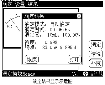 滴定結(jié)束后,如果有終點(diǎn)存在,那么儀器會自動在菜單項(xiàng)上增加“結(jié)果”項(xiàng),用戶可計(jì)算濃度并打印測量結(jié)果。