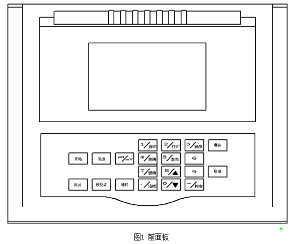 儀器的前面板示意圖見圖1。顯示器為240×128點(diǎn)陣的圖形點(diǎn)陣液晶。儀器共有20個(gè)按鍵,其中9個(gè)為復(fù)用鍵。各按鍵的基本功能如下: