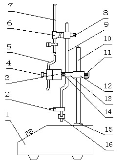 (4) 將滴管夾(6)安裝在序號(hào)9的滴管架(二)上,調(diào)節(jié)至合適位置,旋緊滴管架固定螺絲(8)固定之;