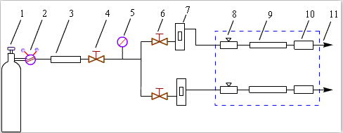 圖中:1—高壓氣瓶(載氣);2—減壓閥(氫氣表或氧氣表);3—凈化器;4—穩(wěn)壓閥;5—壓力表;6—針閥或穩(wěn)流閥;7—壓力表;8—汽化室;9—色譜柱;10—檢測(cè)器;11—恒溫箱。