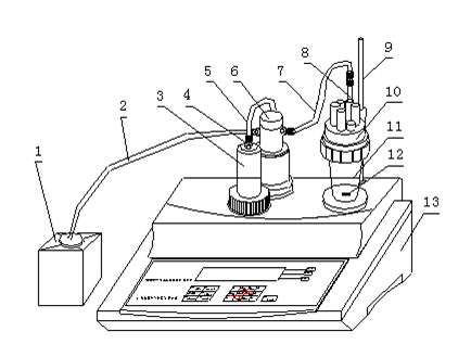 c 將滴定管(3)安裝在主機(13)上,注意,滴定管上的活塞桿應插入頂桿上的燕尾槽內,然后拼緊滴定管(3)上的螺母;按圖插入滴液管(8);然后按圖所示分別將輸液管(2)(最長的一根)、輸液管(5)(最短的一根)、輸液管(7)用接口螺母(4)聯(lián)接好,注意,接口螺母(4)一定要拼緊,不得有泄漏現(xiàn)象。