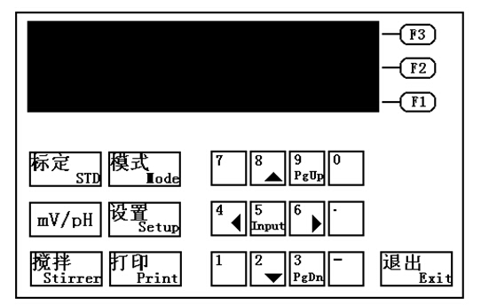 儀器共有22個鍵,分別為:數(shù)字(0~9)、負號、小數(shù)點、F1、F2、F3、mV/pH、標定、模式、設置、攪拌、打印、和退出鍵。其中有些鍵為復用鍵。以下為這些鍵的使用介紹。