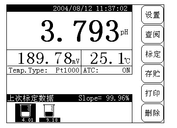 為了方便用戶使用,儀器一開機即進(jìn)入pH測量狀態(tài),顯示如圖(1)所示,其中顯示屏上方顯示有當(dāng)前的pH測量結(jié)果和系統(tǒng)時間、下方為對應(yīng)的電位和當(dāng)前溫度值以及溫度電極類型和自動溫度補償狀態(tài)提示;顯示屏右面為按鍵。圖中即表示儀器的起始狀態(tài)。