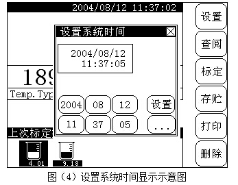 按“設(shè)置”鍵,再按“確認(rèn)”鍵,儀器進(jìn)入設(shè)置系統(tǒng)時間模塊,用戶可以設(shè)置系統(tǒng)時間,窗口上方為當(dāng)前的系統(tǒng)時間,下方為對應(yīng)的時間按鍵,包括“年”、“月”、“日”、“時”、“分”、“秒”鍵,顯示如圖(3)所示: