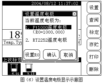 本儀器允許連接二種溫度電極,即Pt1000溫度電極(T-820D或T-820C型溫度傳感器)或者本廠生產(chǎn)的RT2252溫度電極(T-818-B-6型溫度傳感器),用戶必須按照儀器連接的溫度傳感器類型設(shè)置相應(yīng)的溫度電極。按“設(shè)置”鍵,選擇“溫度電極”項,按“確認(rèn)”鍵,儀器即進(jìn)入溫度電極設(shè)置模塊,顯示如圖(6)所示。