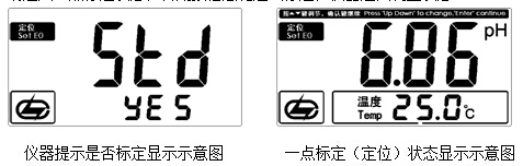 e) 如果用戶使用的是其他標(biāo)準(zhǔn)緩沖溶液,則首先需要按“定位△”或“定位▽”鍵調(diào)節(jié)顯示值,使pH顯示為該溫度下標(biāo)準(zhǔn)溶液的pH值,然后按“確認(rèn)”鍵,完成標(biāo)定。