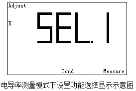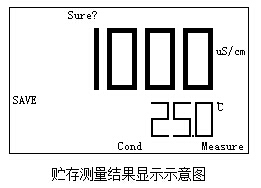 3、“模式/確認”鍵:此鍵為雙功能鍵。在測量狀態(tài)下,按此鍵可以在電導率、TDS、鹽度三個測量模式間依次切換;在其他狀態(tài),包括設置電極常數(shù)、溫度補償系數(shù)、存貯測量結(jié)果等功能模塊操作時用以確認本次操作,具體可參見各功能模塊。