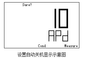 為了更好的使用儀器、延長儀器的使用時間,本儀器具有自動關機功能。當用戶在自動關機時間內(nèi)沒有任何按鍵操作的話,儀器自動關機。在設置選項里面選擇自動關機項(顯示屏右下方顯示“APd”字樣)按“模式/確認”鍵,即可進入自動關機功能模塊,顯示如圖: