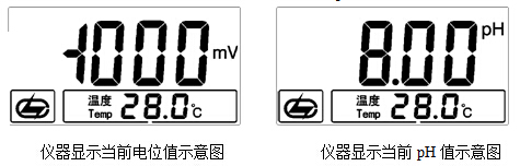其中顯示屏上方為當(dāng)前的電位值或者pH值,下方為設(shè)定的溫度值。