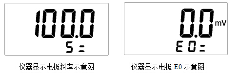 鍵,儀器存貯當(dāng)前的標(biāo)定結(jié)果,并顯示斜率和E0值,返回測量狀態(tài);如果用戶想放棄標(biāo)定,可按“pH/mV”鍵,儀器退出標(biāo)定狀態(tài),返回當(dāng)前測量狀態(tài)。